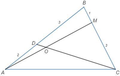 точка d лежит на стороне ав точка м на стороне Вс треугольника авс, ad:db=2:3, и bm:mc=1:3. Отрезки am и cd пересекаются в точке о. Чему равно отношение ao:om и co:od?