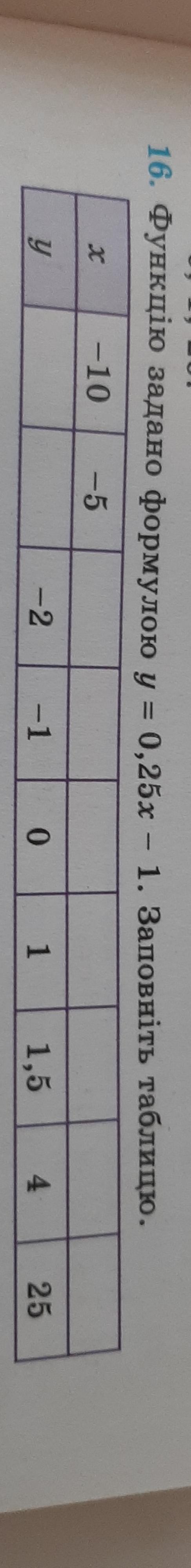 Функцію задано формулою y=25x-1. Заповніть таблицю. Только пожалуйста нужно с обьяснениям!!!!!!