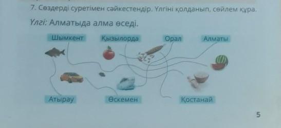 7. Сөздерді суретімен сәйкестендір. Үлгіні қолданып, сөйлем құра. Үлгі: Алматыда алма өседі. Шымкент Қызылорда Орал Алматы Атырау Өскемен Қостанай