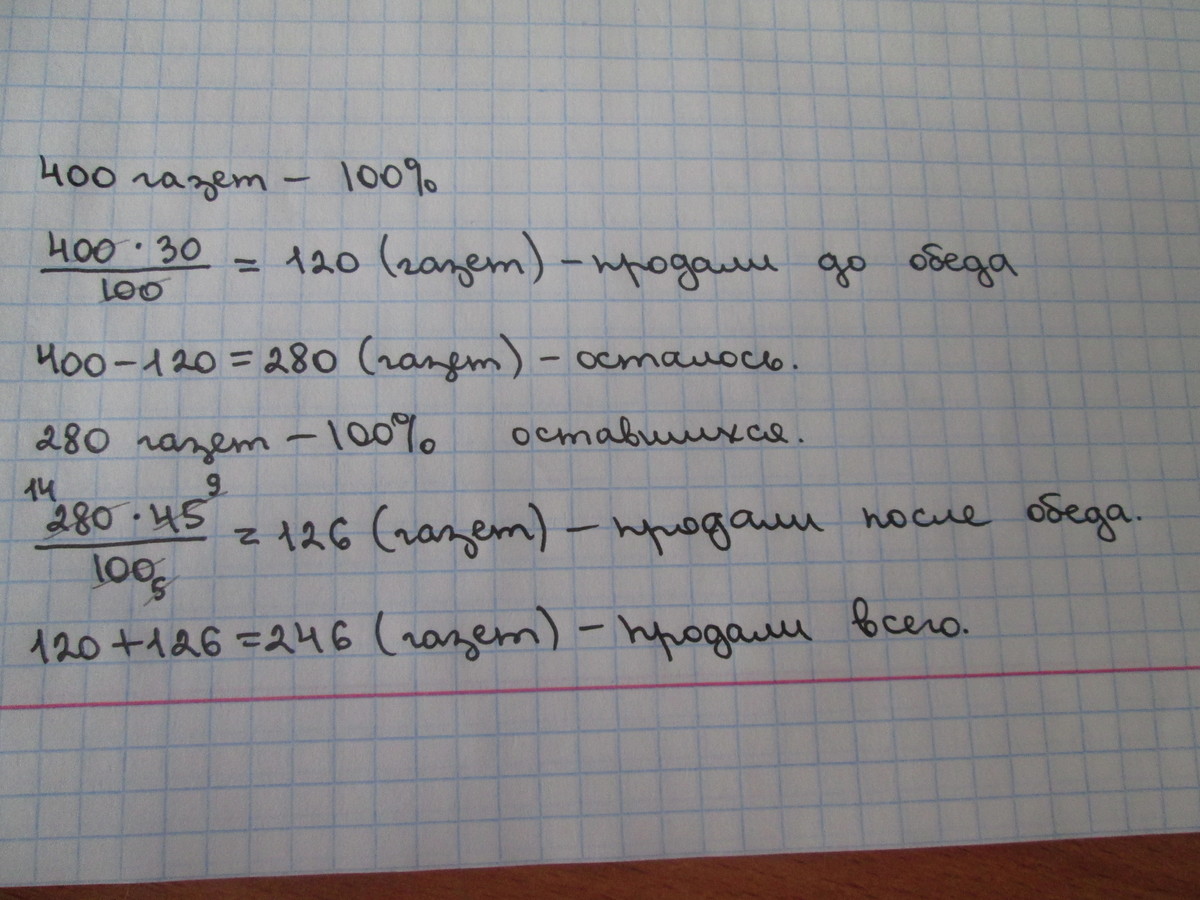 1) В киоск привезли 400 газет. До обеда продали 30% всех газет, а после обеда 45% остававшихся. Сколько всего Продали газет?