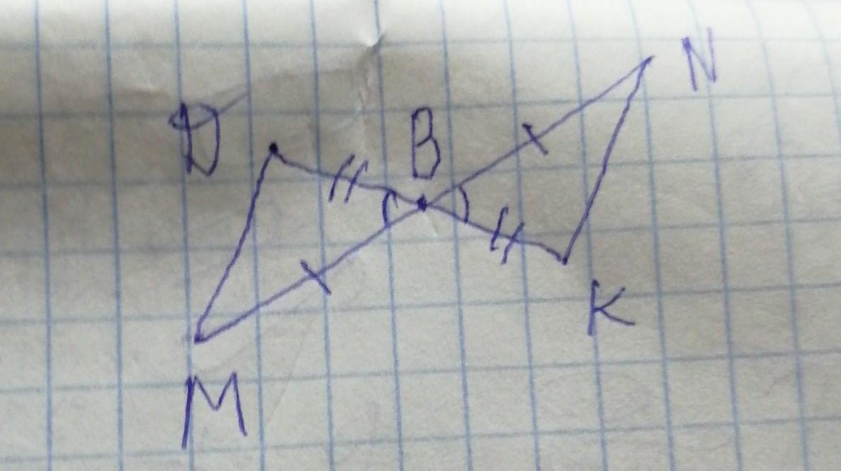 Тр-к МDB=тр-ку NKB по первому признаку равенства треугольников (по двум сторонам и углу между ними)