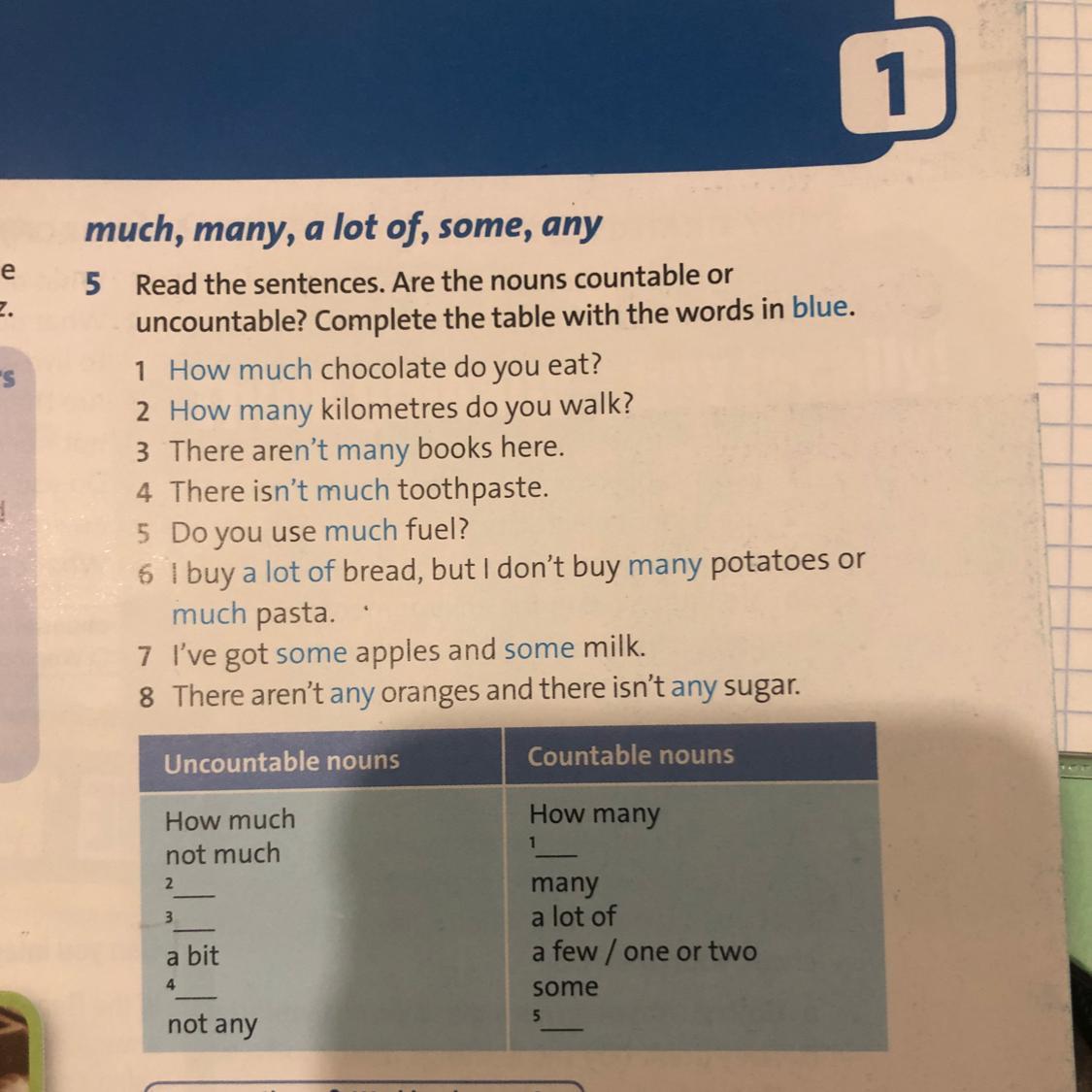 Сколько шоколада вы едите? 2 Сколько километров вы идете? 3 Здесь не так много книг. 4 Зубной пасты не так много. 3 Вы потребляете много топлива? 6 Я покупаю много хлеба, но не покупаю много картошки или макарон. 7 У меня есть яблоки и немного молока. Нет ни апельсинов, ни сахара.