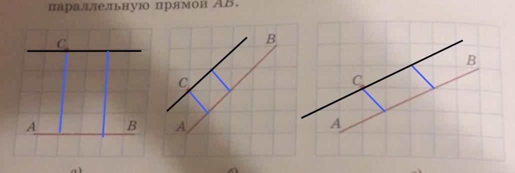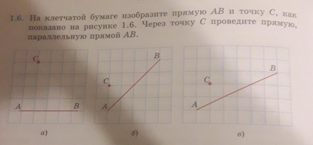 1.6. На клетчатой бумаге изобразите прямую AB и точку С, как параллельную прямой AB.
