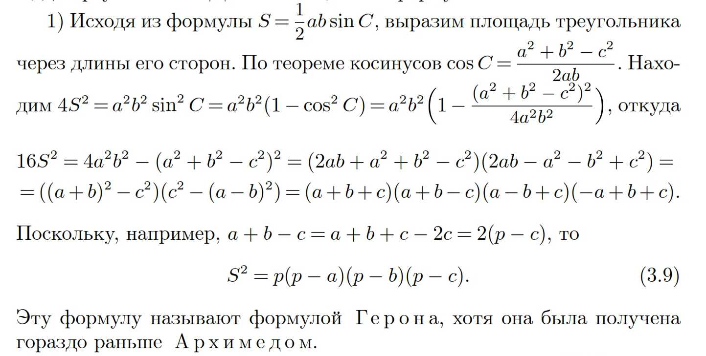 Кстати, формулу Герона не так-то просто доказать. Если заданы стороны треугольника, то площадь выражается через произведение сторон и угол между ними