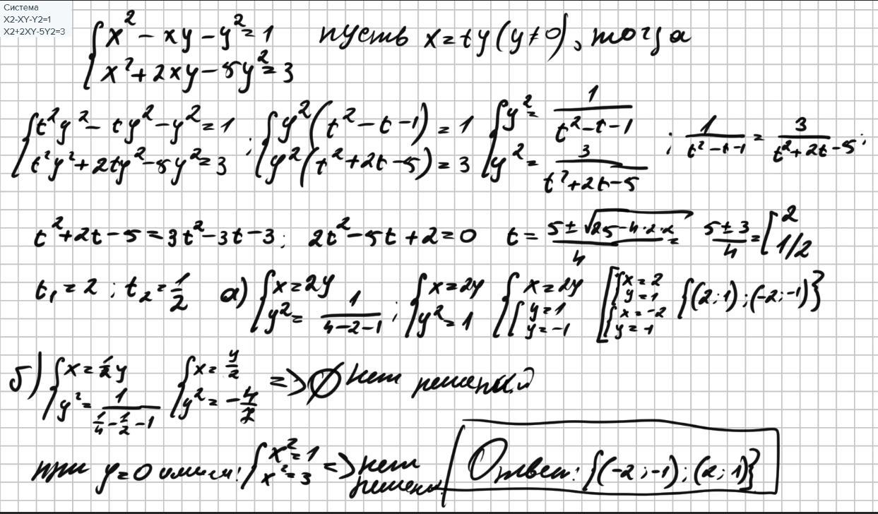 Бородатая задачка, умножаем первое на 3 и вычитаем второе, тем самым получив однородное уравнение, что решается делением на y^2 и заменой: x/y = t