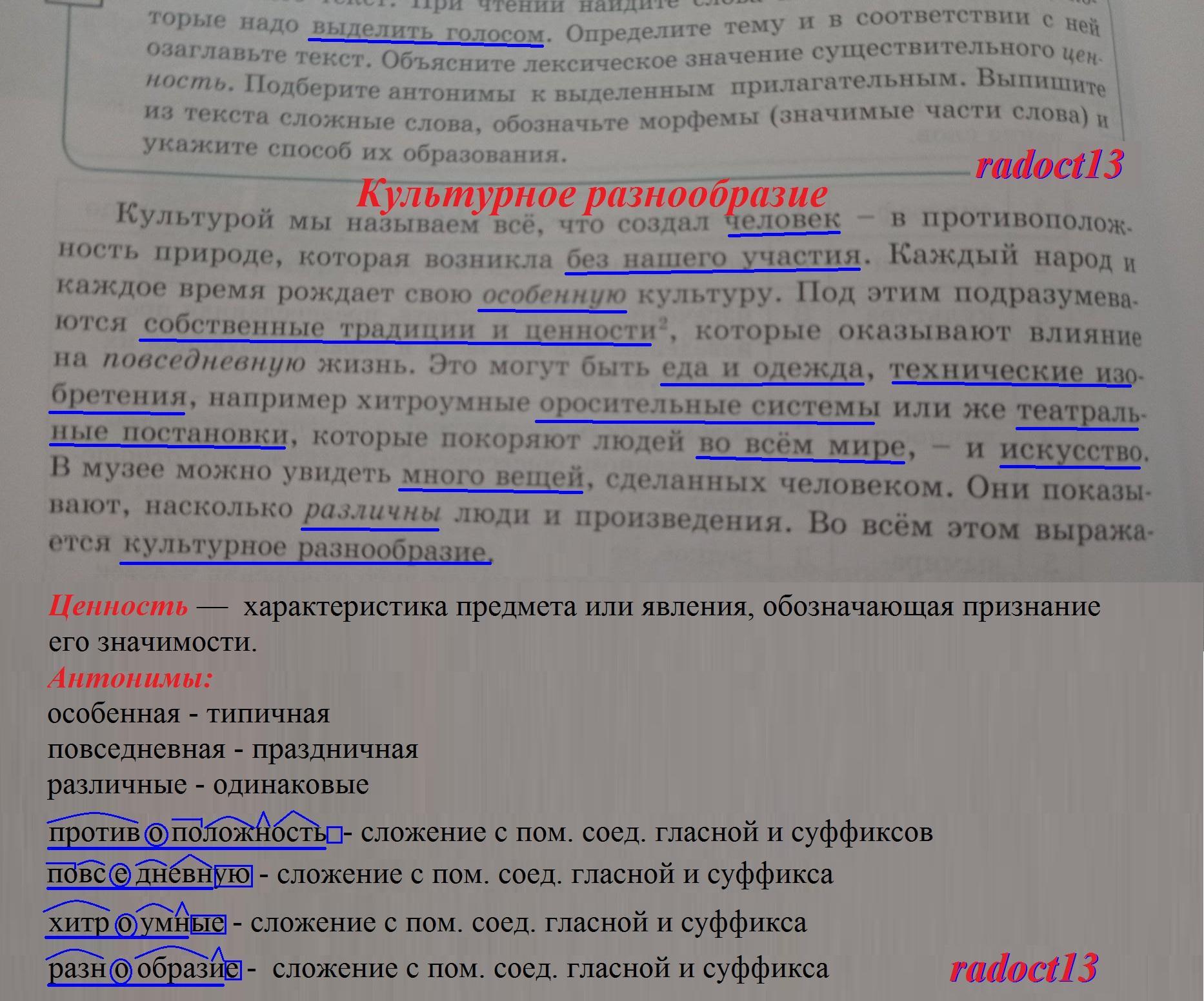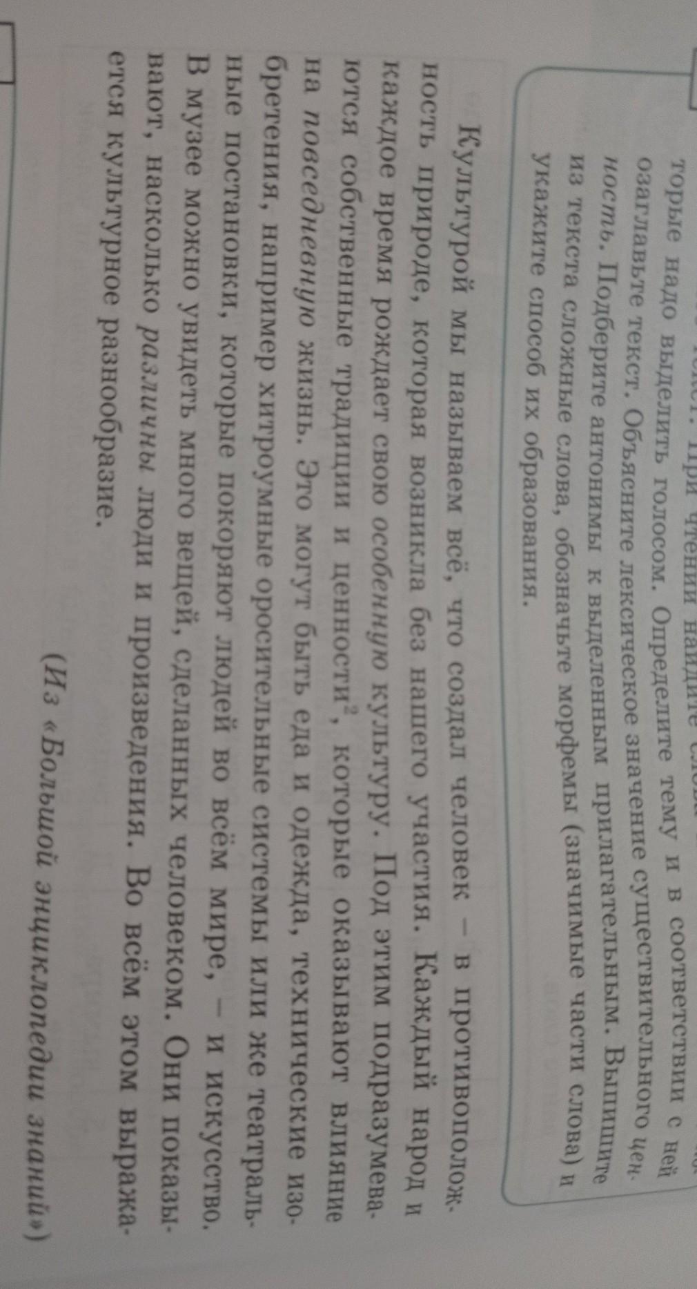 4 Прочитайте текст. При чтении найдите слова или словосочетания, ко- торые надо выделить голосом. Определите тему и в соответствии с ней озаглавьте текст. Объясните лексическое значение существительного цен- ность. Подберите антонимы к выделенным прилагательным. Выпишите из текста сложные слова, обозначьте морфемы (значимые части слова) и укажите способ их образования. Культурой мы называем всё, что создал человек - в противополож- ность природе, которая возникла без нашего участия. Каждый народ и каждое время рождает свою особенную культуру. Под этим подразумева- ются собственные традиции и ценности, которые оказывают влияние на повседневную жизнь. Это могут быть еда и одежда, технические изо- бретения, например хитроумные оросительные системы или же театраль- ные постановки, которые покоряют людей во всём мире, - и искусство. В музее можно увидеть много вещей, сделанных человеком. Они показы- вают, насколько различны люди и произведения. Во всём этом выража- ется культурное разнообразие. (Из «Большой энциклопедии знаний)