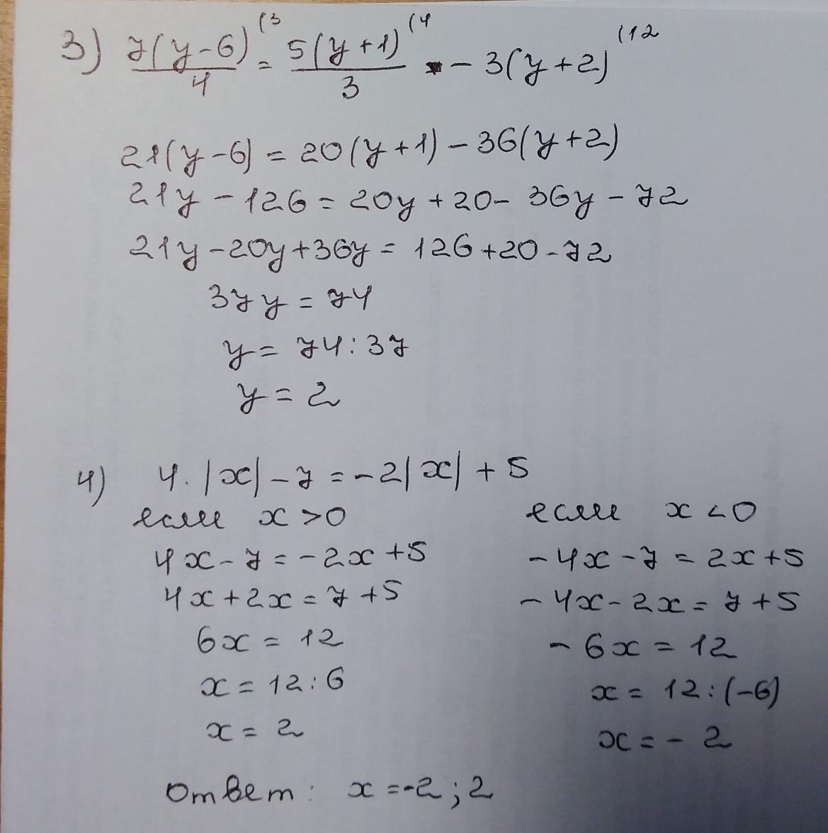 0.4. Решите уравнение: 3) 7(у – 6) 5(у + 1) 4 3 — -3(y + 2); 3 3 2) x + 2x + 5 = 2 - x + 4,1 +0,9;