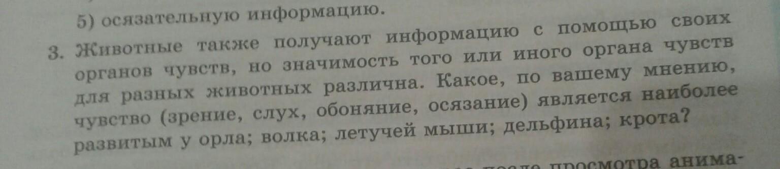 у орла зрение, у волка - обоняние, у летучей мыши и дельфина - слух и у крота - осязание.