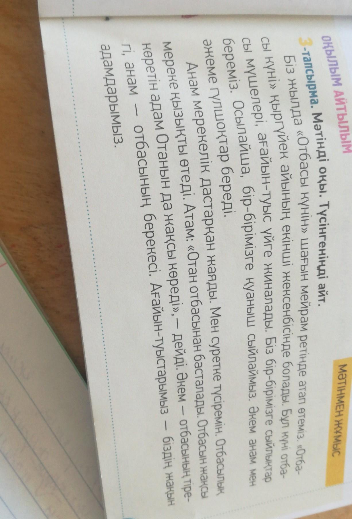 7-тапсырма. Мәтінді тыңда. Сұрақтарға жауап бер. Мәтіндегі дерексіз зат есімдерді тап. 1. Мәтіннің кейіпкері — кім? 3. Олар «Отбасы күнінде» не істеді? 2. Оның анасы, әкесі — кім?