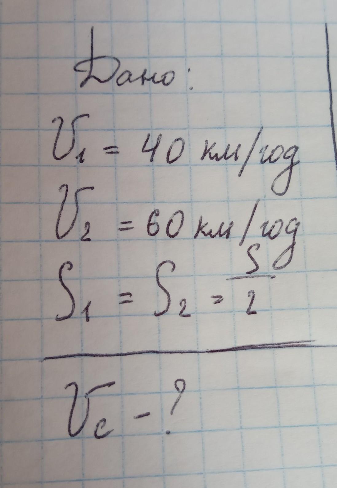 vc=(s/2+s/2)/(s/(2*v1)+s/(2*v2))=2*v1*v2/(v1+v2)=2*40*60/(40+60)=48 км/ч