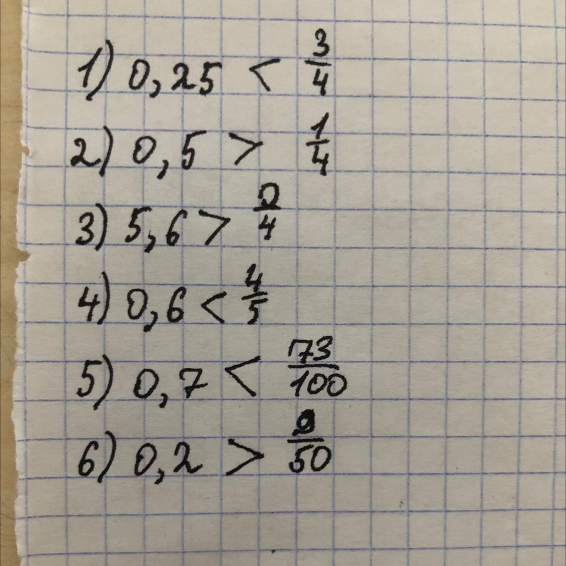 31. Сравните дроби: 1) 0, 25 и 3/4; 2) 0, 5 и 1/4; 3) 5, 6 и 0/4; 4) 0, 6 и 4/5; 5) 0, 7 и 73/100 6) 0, 2 и 9/50.