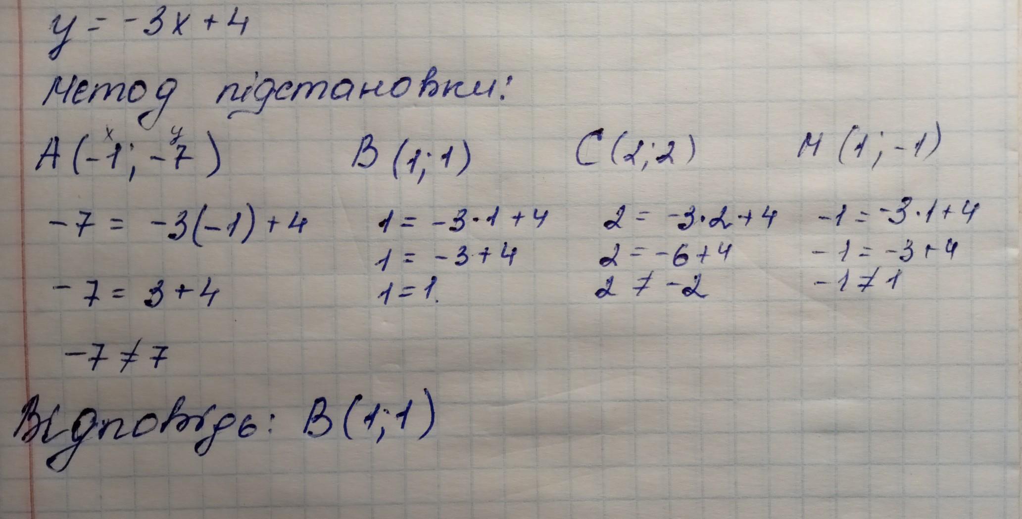 Не виконуючи побудови укажіть,через яку з наведених точок проходить графік функції y=-3x+4