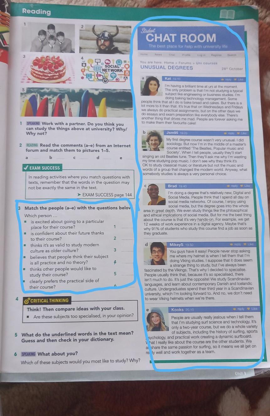 3 Match the people (a-e) with the questions below. • is excited about going to a particular place for their course?