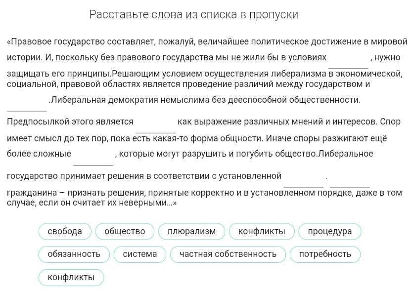 Ответ: свобода, общество, плюрализм, конфликты, процедура, обязанность.