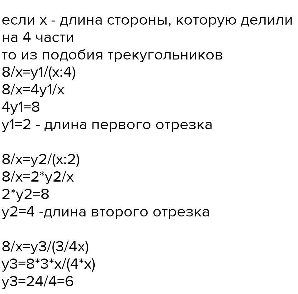 Боковая сторона треугольника разделена на 4 равные части, и из точек деления проведены к другой боковой стороне отрезки, параллельные основанию треугольни- ка. Чему равны длины этих отрезков, если основание треугольника равно 8 см?