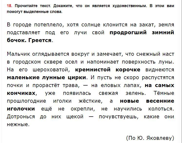 P 18. Прочитайте текст. Докажите, что он является художественным. В этом вам помогут выделенные слова. В городе потеплело, хотя солнце клонится на закат, зем- ля подставляет под его лучи свой продросший зимний бо- чок. Греется. Мальчик оглядывается вокруг и замечает, что снежный наст в городском сквере осел и напоминает поверхность луны. На его шероховатой, кремнистой корочке виднеют- ся маленькие лунные цирки. И пусть оро распустятся почки и прорастёт трава, на елых л пах, на самых кончиках, уже появилась свежая зелень. ёмные прошло- годние иголки жёсткие, а но е весенни иголочки ещё, плис как определить текст