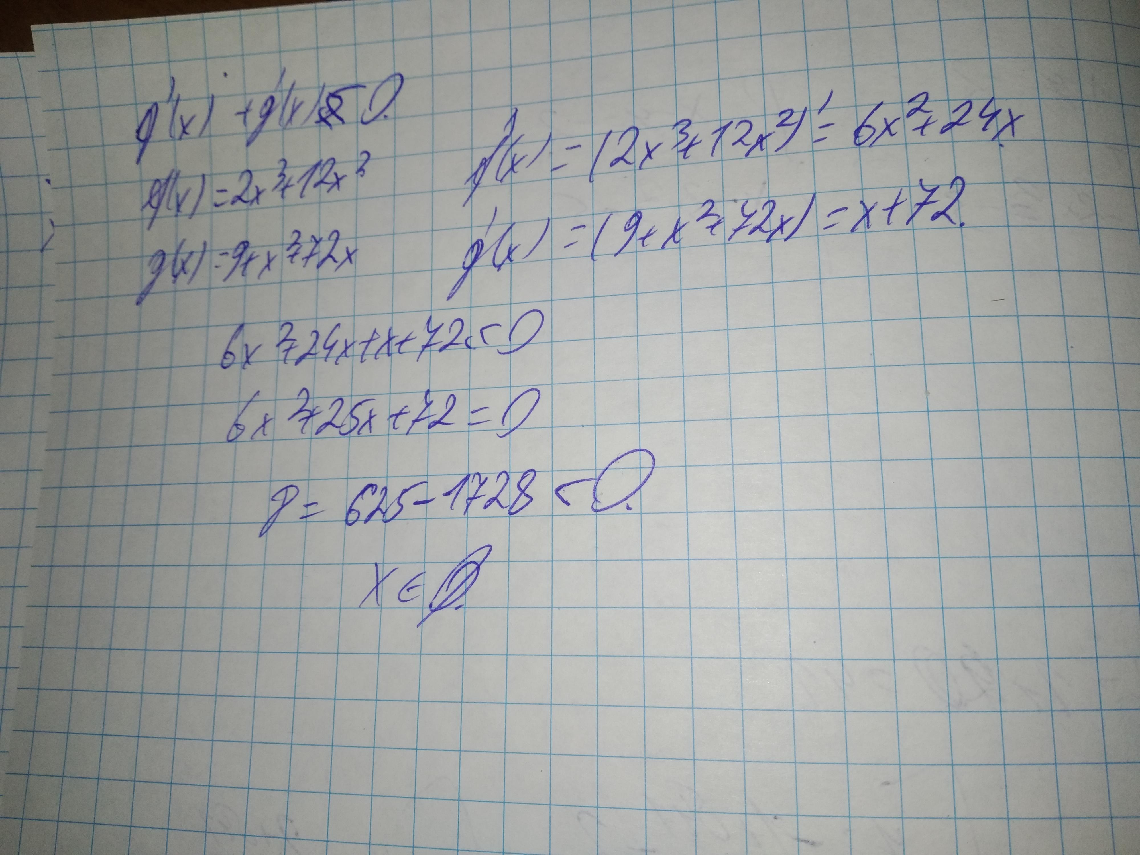 Надо находить сумму их производных потом решить неравенство так как у нас получилось такое неравенство где он всегда больше 0 , отсюда делаем вывод что нету такие х которое устраивают нас.