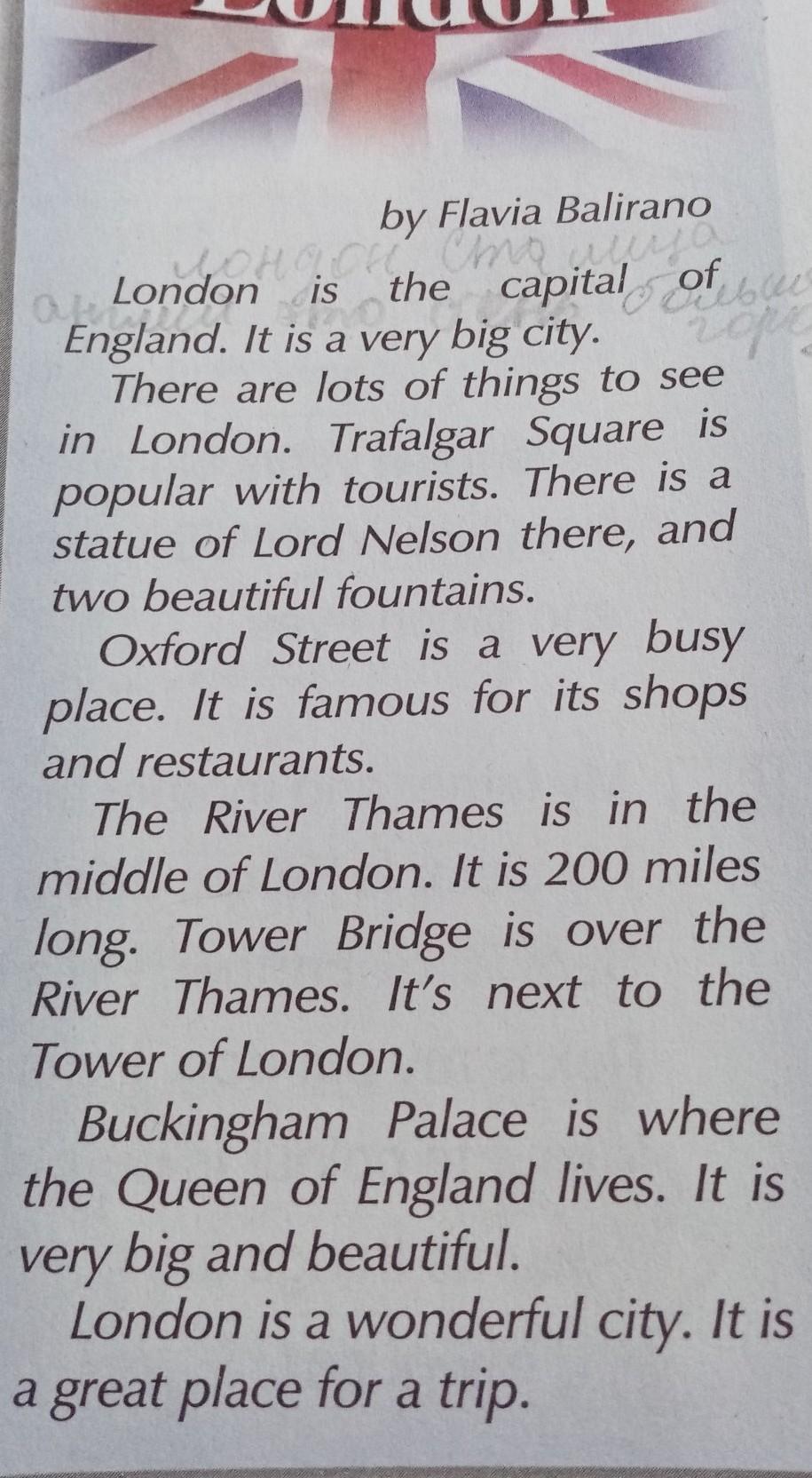 существует много чего, что можно посмотреть в лондоне. трафальгарская площадь популярна среди туристов. на ней находится статуя лорда нельсона и 2 чудесных фонтана. улица оксфорда очень занятое место. оно известно своими магазинами и ресторанами. река темза проходит по центру лондона. ее длина 200 миль. мост тауэра проходит над темзой. он находится после тауэра лондона (башни лондона). букингемский дворец - место, где живет королева англии. он ооочень большой и красивый. лондон - чудесный город. он-отличное место для поездки (путешествия).