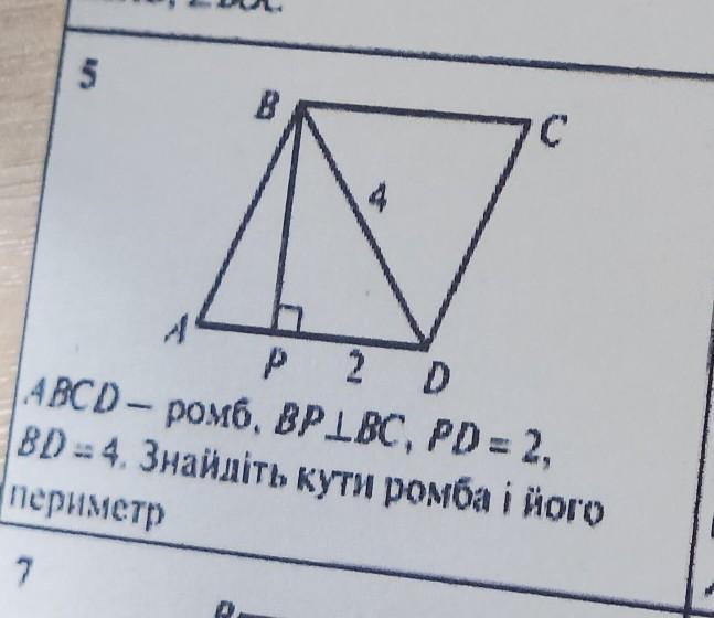 ABCD - ромб, ВР перпендикулярно ВС, PD = 2, BD = 4. Найти углы ромба и его периметр