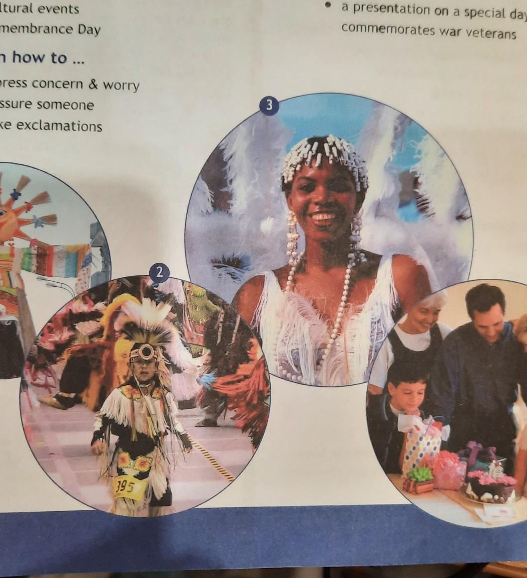 3) In the picture I can see a pretty woman. She is wearing a white dress with feathers. Maybe his costume made for carnival