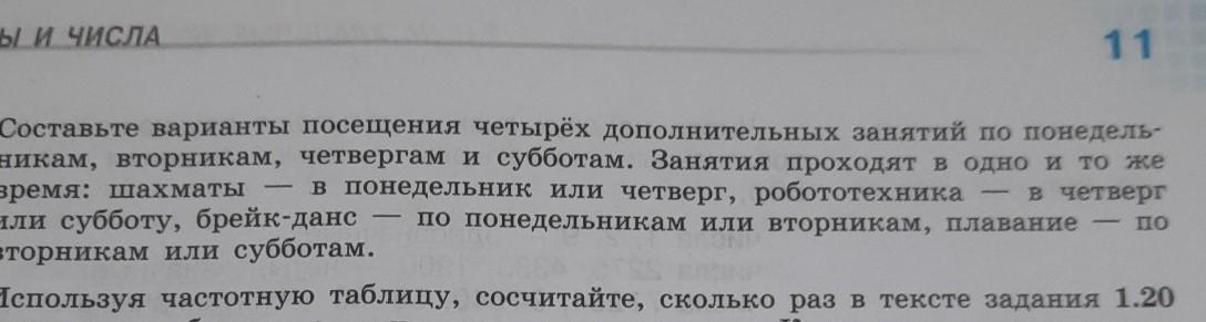 Составьте варианты посещения которых дополнительных занятий по понедельникам вторникам четвергам и субботам Занятия проходят в одно и тоже время шахматы в понедельник или четверг Робототехника в четверг или субботу брейк-данс по понедельникам вторникам страхование по вторникам или субботам