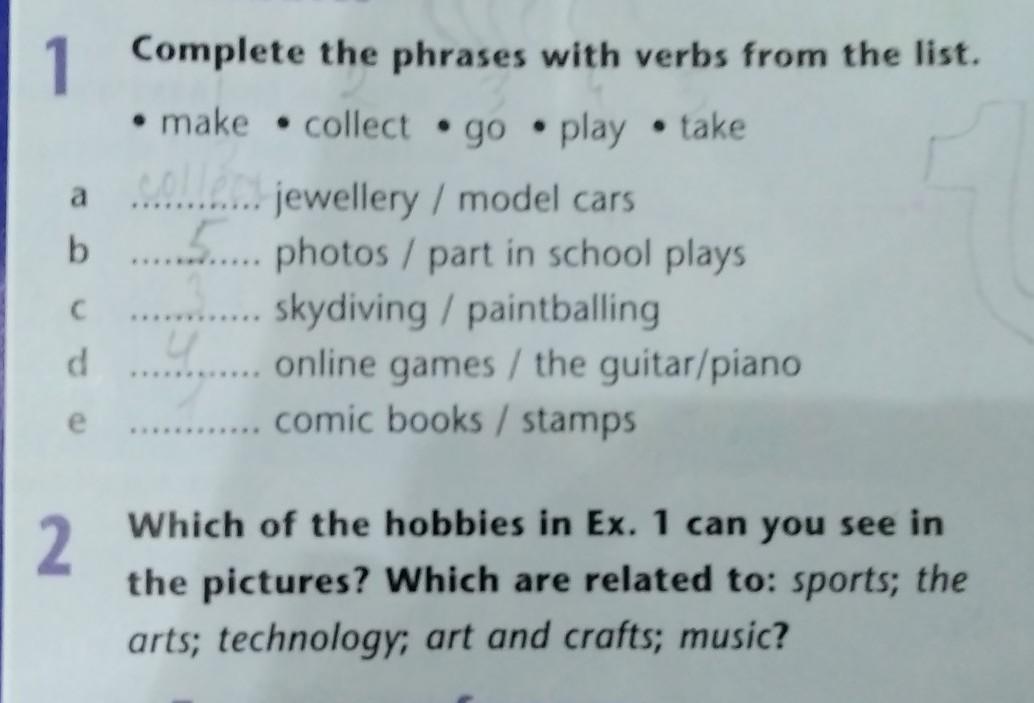 2. Which of the hobbies in Ex. 1 can you see in the pictures? Which are related to: sports; the arts; technology; art and crafts; music?