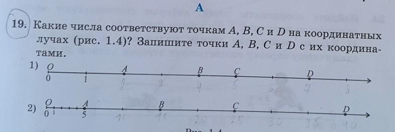 А Какие числа соответствуют точкам A, B, C и D на координатных лучах (рис. 1.4)? Запишите точки A, B, C и Dc их координа- тами. 1) о A B с G D 0 2 3 4 5 6 1 8 с c р 10 20 25 30 40 B 2) & D 5 10 35