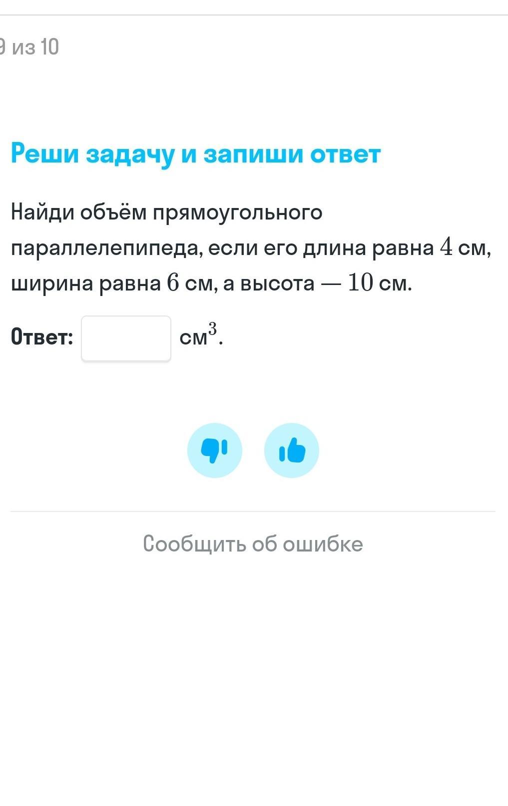 Найди объём прямоугольного параллелепипеда, если его длина равна 4 см, ширина равна б см, а высота - 10 см.