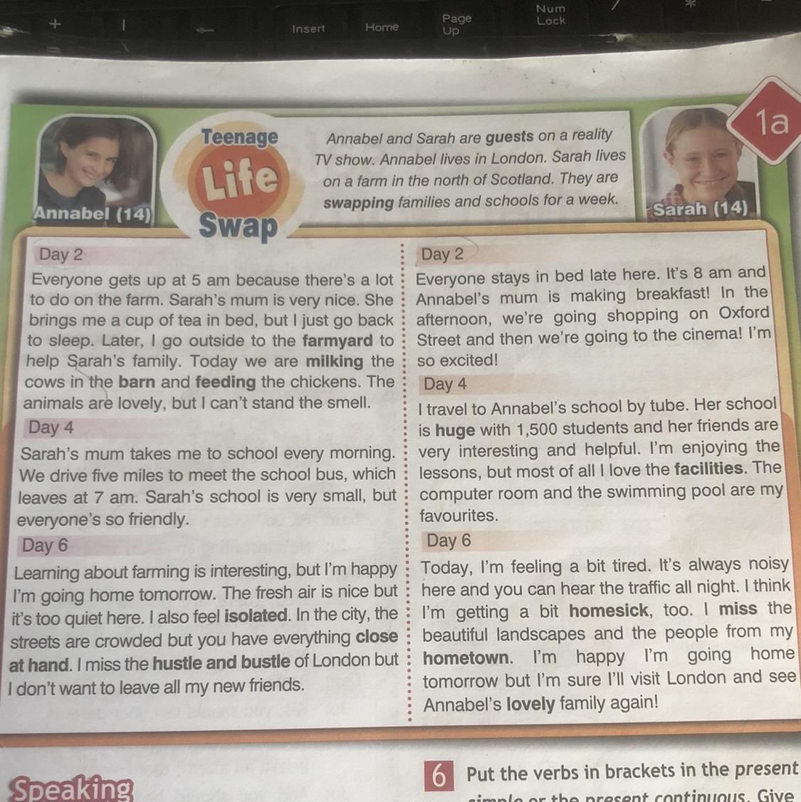 День 2 День 2 Все встают в 5 утра, потому что их много: Здесь все ложатся поздно. Сейчас 8 утра, и дела на ферме. Мама Сары очень милая. Она: Мама Аннабель готовит завтрак! Он приносит мне чашку чая в постель, но я просто иду спать после обеда, мы идем за покупками на Оксфорд, чтобы поспать. Позже я выхожу на ферму, чтобы помочь семье Сары. Сегодня мы молим коров в сарае и кормим цыплят. Животные милые, но я не переношу запаха. День 4 Стрит, а потом мы идем в кино! Я так взволнован! День 4 Я еду в школу Аннабель на метро. Ее школа огромна, в ней учатся 1500 учеников, и ее друзья очень интересны и полезны. Мне нравится, что мама Сары каждое утро водит меня в школу. Мы едем пять миль, чтобы встретить школьный автобус, который: уроки, но больше всего мне нравятся удобства. Листья в 7 ан. Школа Сары очень маленькая, но: компьютерный класс и бассейн - все мои очень дружелюбные. День 6 Обучать сельскому хозяйству интересно, но я счастлив: сегодня я немного устал. Всегда шумно. Я иду домой завтра. Свежий воздух приятный, но: здесь и всю ночь слышно шум машин. Думаю, здесь слишком тихо. Я тоже чувствую себя изолированным. В городе: Я тоже немного скучаю по дому. Я скучаю по улицам, многолюдно, но у вас все рядом: красивые пейзажи и люди из-за меня под рукой. Я скучаю по хрипе и суете Лондона, но по родному городу. Я счастлив, что иду домой, я не хочу расставаться со всеми моими новыми друзьями. избранное. Завтра день 6, но я уверен, что приеду в Лондон и снова увижу прекрасную семью Аннабель!