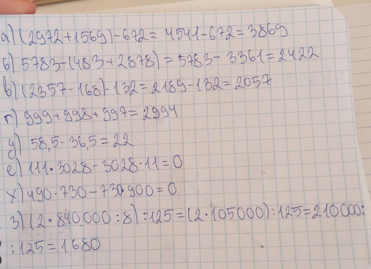 вычислите наиболее удобным способом: a) (2972 +1569)-672; 6) 5783 - (483 +2878); B) (2357-168)-132; r) 999 +998 +997; Д) 58.5-36.5; e) 111 3028-3028 11; x) 490 730-73 900; 3) (2 840 000:8): 125; n) (2.3 7 13): (3-7); K) (3 5 11 17 23): (3 11.17):