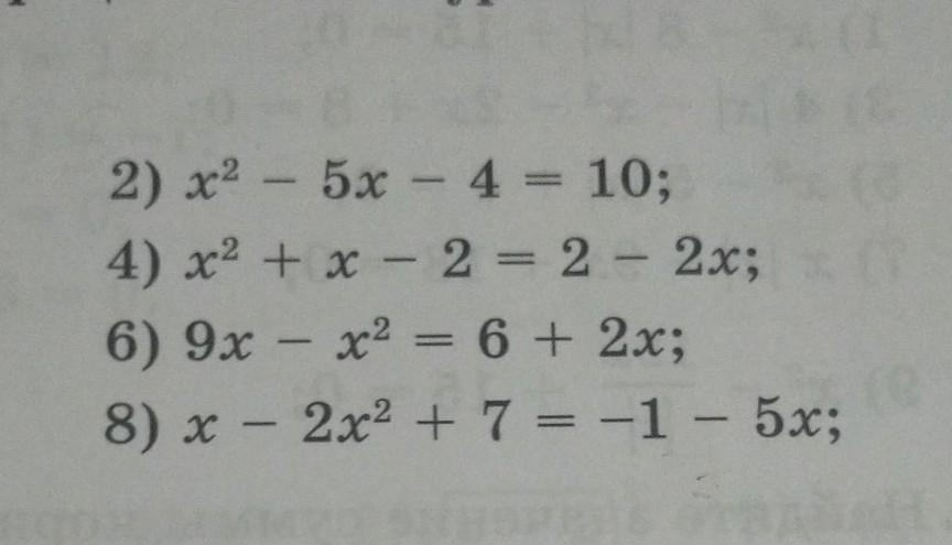 2) x² – 5x - 4 = 10; 4) x²+ x - 2 = 2 - 2x; 6) 9x - x²= 6 + 2x; 8) x - 2x² + 7 = -1 - 5x;