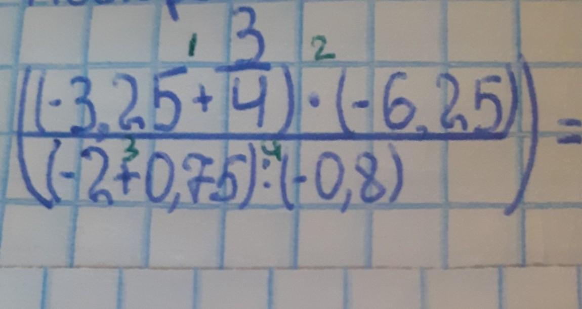 ((-3.25 + 3/4)*(-6.25)) / ((-2 + 0.75) : (-0.8)) = ((-3.25 + 3/4)*(-6.25)*(-0.8)) / ((-2 + 0.75) = .....