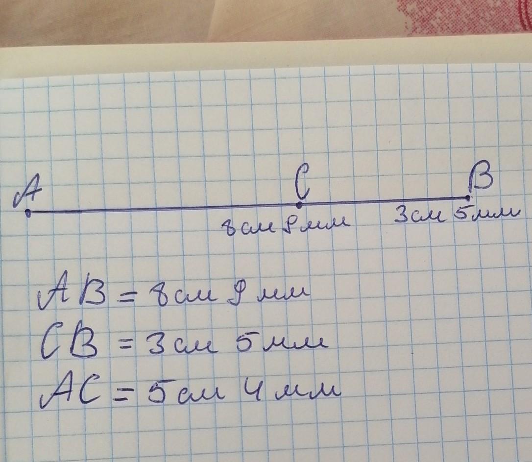 Накресліть відрізок АВ, довжина якого дорівнює 8 см 9 мм. Позначте на ньому точку С так, щоб СВ = 3 см 5 мм. Обчисліть довжину відрізка АС.