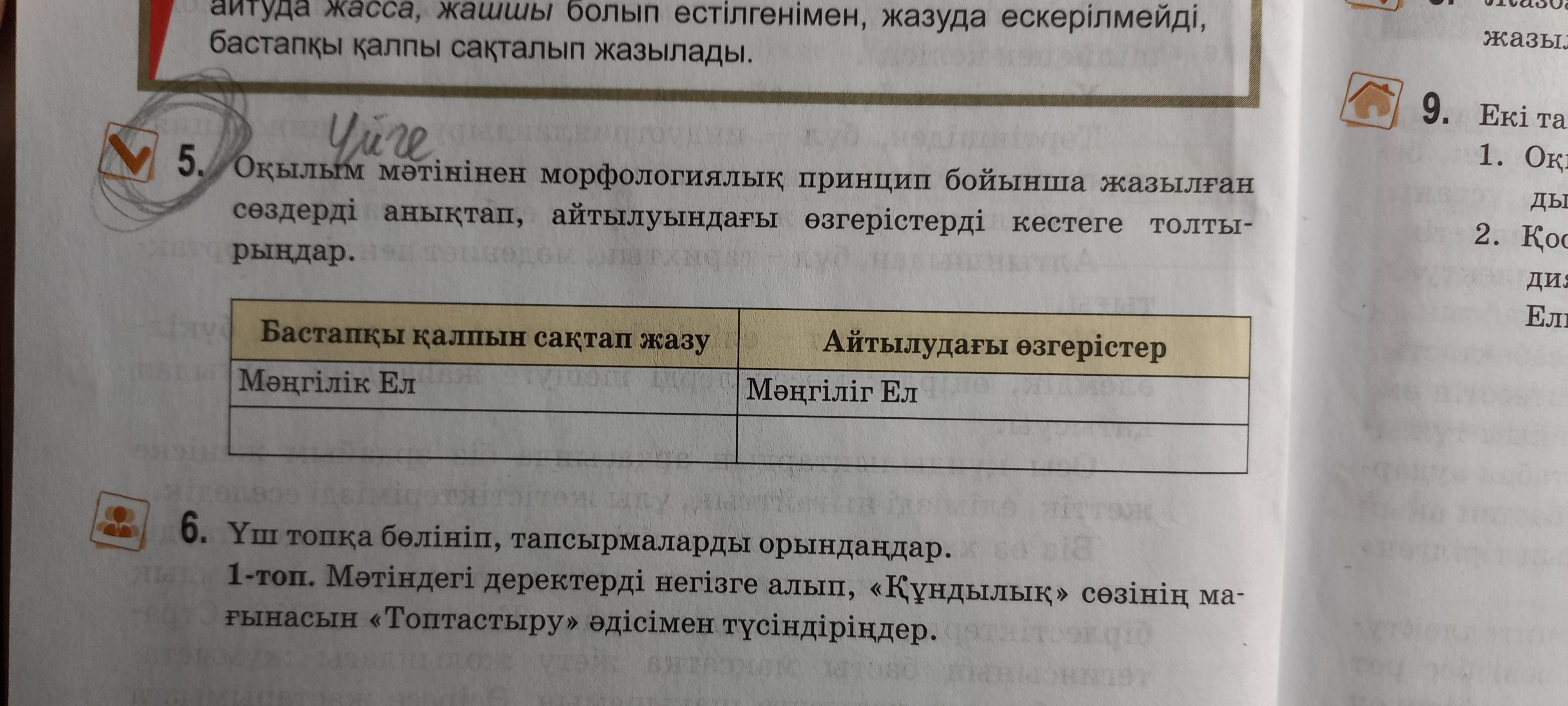 оқылым мәтінінен морфологиялық принцип бойынша жазылған сөздерді анықтап айтылуындағы өзгерістерді кестеге толтырындар