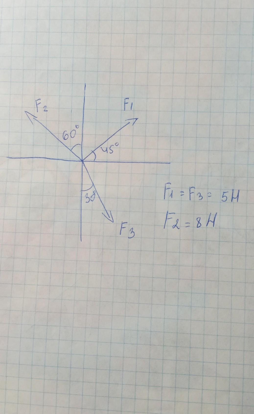 Щоб знайти проекцію вектора на вісь потрібно помножити чисельне значення вектора на кут цього вектора на вісь. Таким чином проекція вектора F1 на вісь x = 5 × cos (45 °) = 5 × √2 / 2 = 5√2 / 2, що приблизно = 3,53.Проекція вектора F2 на вісь y = 8 × cos (60 ° ) = 8 × 0.5 = 4.проекція вектора F3 на вісь y = 5 × cos (30 °) = 5 × √3 / 2 = 5√3 / 2, що приблизно = 4,33
