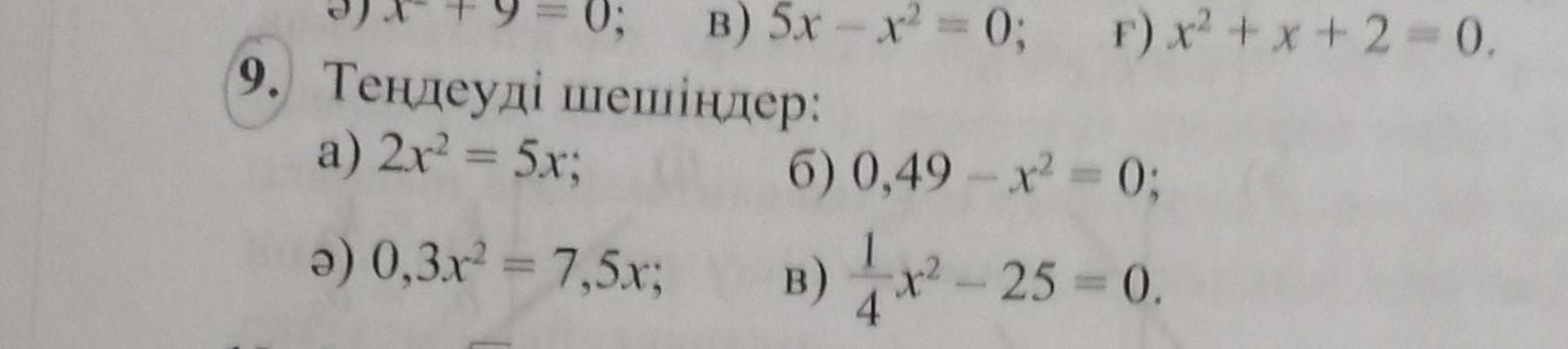 a)2x^2=5x\\2x^2-5x=0\\x(2x-5)=0\\x_1=0\\\\2x-5=0\\2x=5\\x_2=\frac{5}{2} =2\frac{1}{2} \\\\b)0,49-x^2=0\\-x^2=-0,49\\x^2=0,49\\x=б\sqrt{49}\\ x=б0,7\\\\c)0,3x^2=7,5x\\0,3x^2-7,5x=0\\x(0,3x-7,5)=0\\x_1=0\\\\0,3x-7,5=0\\0,3x=7,5\\x=7,5:0,3\\x=25\\\\d)\frac{1}{4} x^2-25=0\\\\\frac{1}{4} x^2=25\\\\x^2=25:\frac{1}{4}\\\\x^2=100\\x=б\sqrt{100}\\x=б10