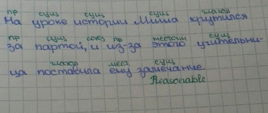 На(предлог) уроке(сущ.) истории(сущ.) Миша(сущ.) крутился(глагол) за(предлог) партой(сущ.), и(союз) из-за(предлог) этого(местоимение) учительница(сущ.) поставила(глагол) ему(местоимение) замечание(сущ.).