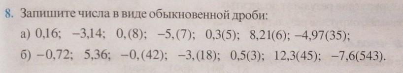 Молю помогите мне срочно!!!! Запишите числа в виде обыкновенной дроби: a) 0,16; -3,14; 0,(8); -5,(7); 0,3(5); 8,21(6); -4,97(35); 6) -0,72; 5,36; -0,(42); -3,(18); 0,5(3); 12,3(45); -7,6(543).