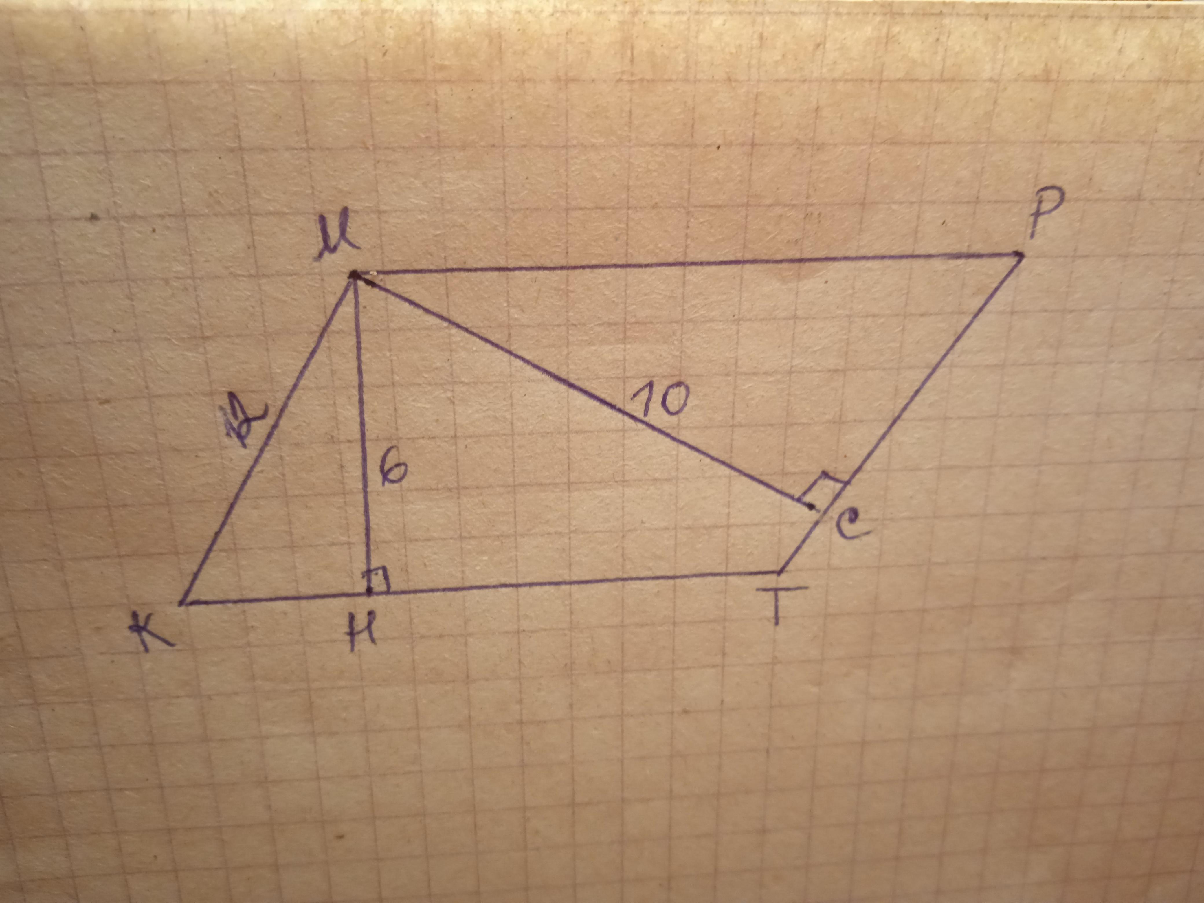 Дано: КМРТ - параллелограмм, МС=10 см, МН=6 см, S=120 см². Найти ∠К.