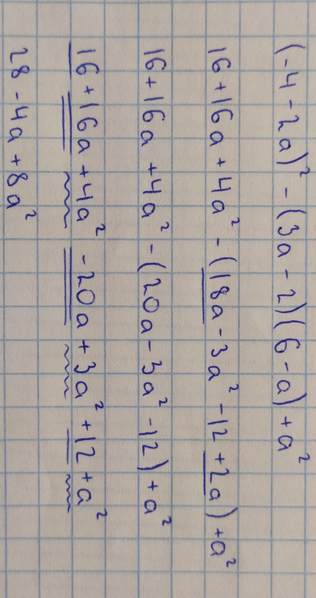 4) -(4-2a)²-(3a-2)(6-a)+a² = -16+16a-4a²+3а²-20а +12+a²=-4-4а