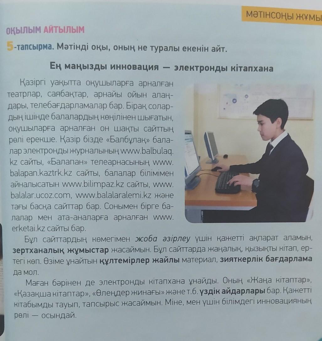 В настоящее время здесь работают театры, парки, специальные детские площадки, телепрограммы для студентов. Но среди них особое место занимает около десятка детских сайтов, которые порадуют детей. Теперь у нас есть сайт детского электронного журнала «Балбулак» www balbulag kz, телеканала «Балапан» www. сайт balapan.kaztrk.kz, сайт www.bilimpaz.kz, www. Существуют и другие сайты, такие как balalar.ucoz.com, www.balalaralemi kz maite, а также для детей и родителей www. Есть сайт erkеtаi.kz. С помощью этих сайтов я получаю необходимую информацию для развития проекта, выполняю лабораторные работы. Новость на этих сайтах - интересная книга, много мужских фамилий. О любимых культемирах очень много материальной и интеллектуальной передачи. Больше всего мне нравится электронная библиотека. Среди его работ «Новые книги», «Казахские книги», «Сборник стихов» и другие. имеет лучшие заголовки. Я найду нужную книгу и закажу. Для меня это роль инноваций в образовании.