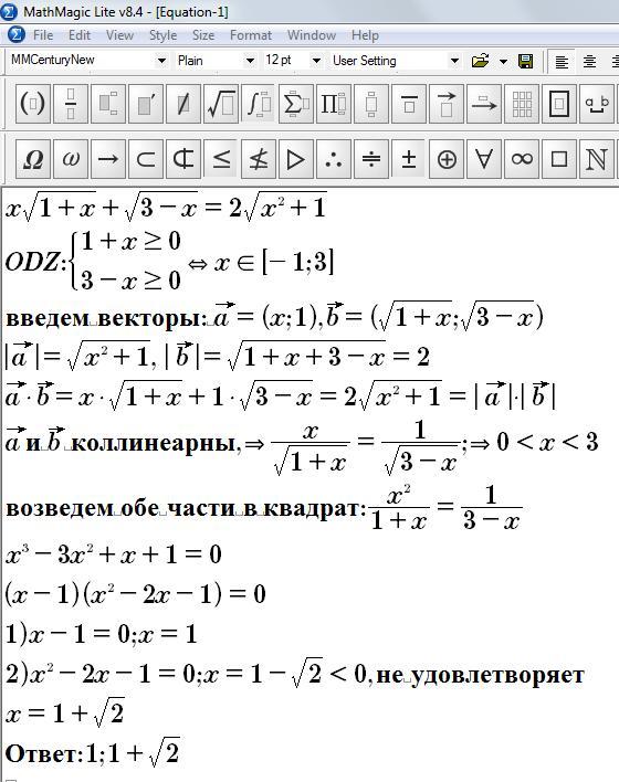 Замечание. Решение получилось не самое простое. Буду рад, если кто-нибудь придумает более простое решение. Но по любому нужно уметь продираться и через такие выкладки. Кстати, я сначала не заметил замену через t, мне пришлось делать еще одно возведение в квадрат. Получилось уравнение шестой степени, в котором дважды выделялась скобка (x-1), а возникающий многочлен 4-й степени оказался полным квадратом (что, конечно, тоже нужно было увидеть).