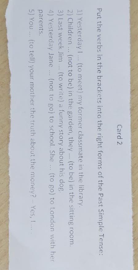 Card 2 Put the verbs in the brackets into the right forms of the Past Simple Tenses I) Yesterday (to meet) my former classmate in the library 2) Children ... (not to be) in the garden, they... (to be) in the sitting room. 3) Last week Jim... (to write) a funny story about his dog 4) Yesterday Jane (not to go) to school. She ... (to go) to London with her parents 5) You to tell) your mother the truth about the money? Yes, I