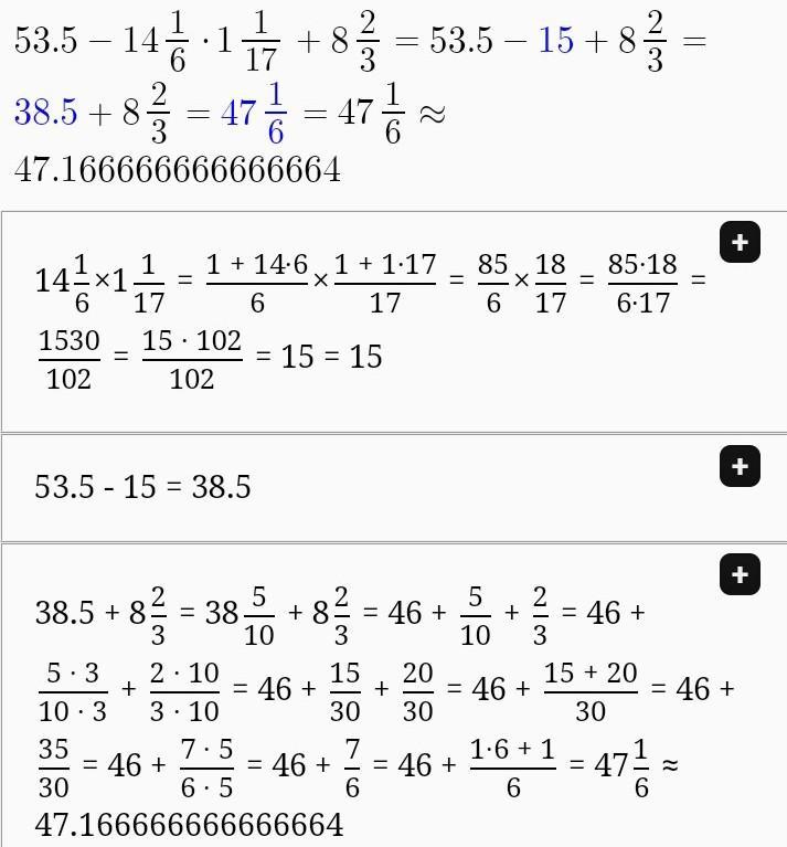 53,5-14 1/6*1 1/17+8 2/3=53 1/2-85/6*18/17+8 2/3=53 1/2-15+8 2/3=38 3/6-8 4/6=29 5/6
