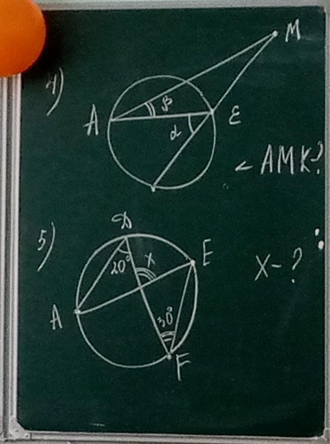 2) По теореме о вписанных углах ∠ADF = ∠AEF = 20. O - пересечение AE и DF. По теореме о внешнем угле для ΔEOF: ∠DOE = ∠AEF + ∠DFE = 20 + 30 = 50