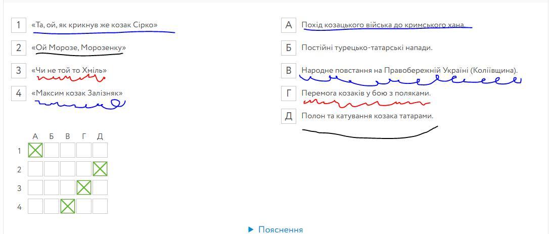 Установіть відповідність між піснею (1-4) та історичними подіями, зображеними у творі (А-Д).