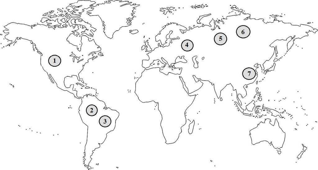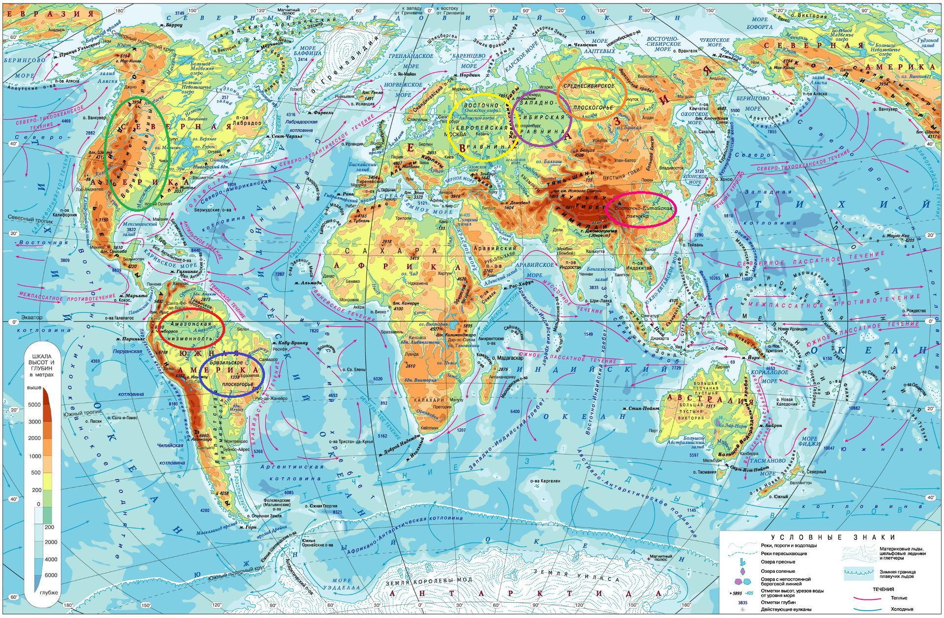 Используя физическую карту мира, укажите какие равнины или плоскогорья скрываются под соответствующими номерами.
