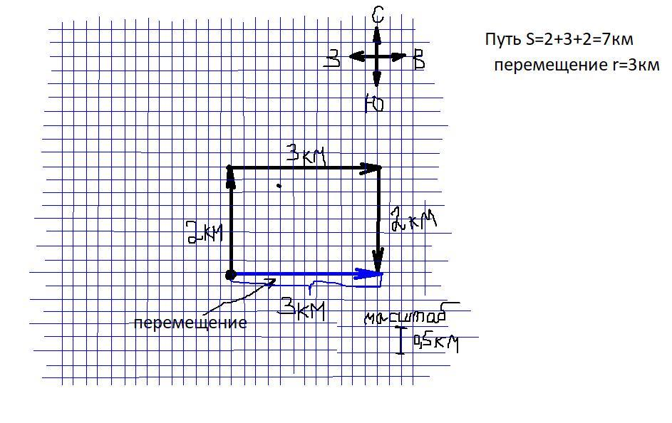 турист прошёл 2 км строго на север, затем 3 км на восток и 2 км на юг. сделайте чертёж, выбрав масштаб: в двух клетках 0,5 км, и найдите путь, пройденный телом и перемещение тела.