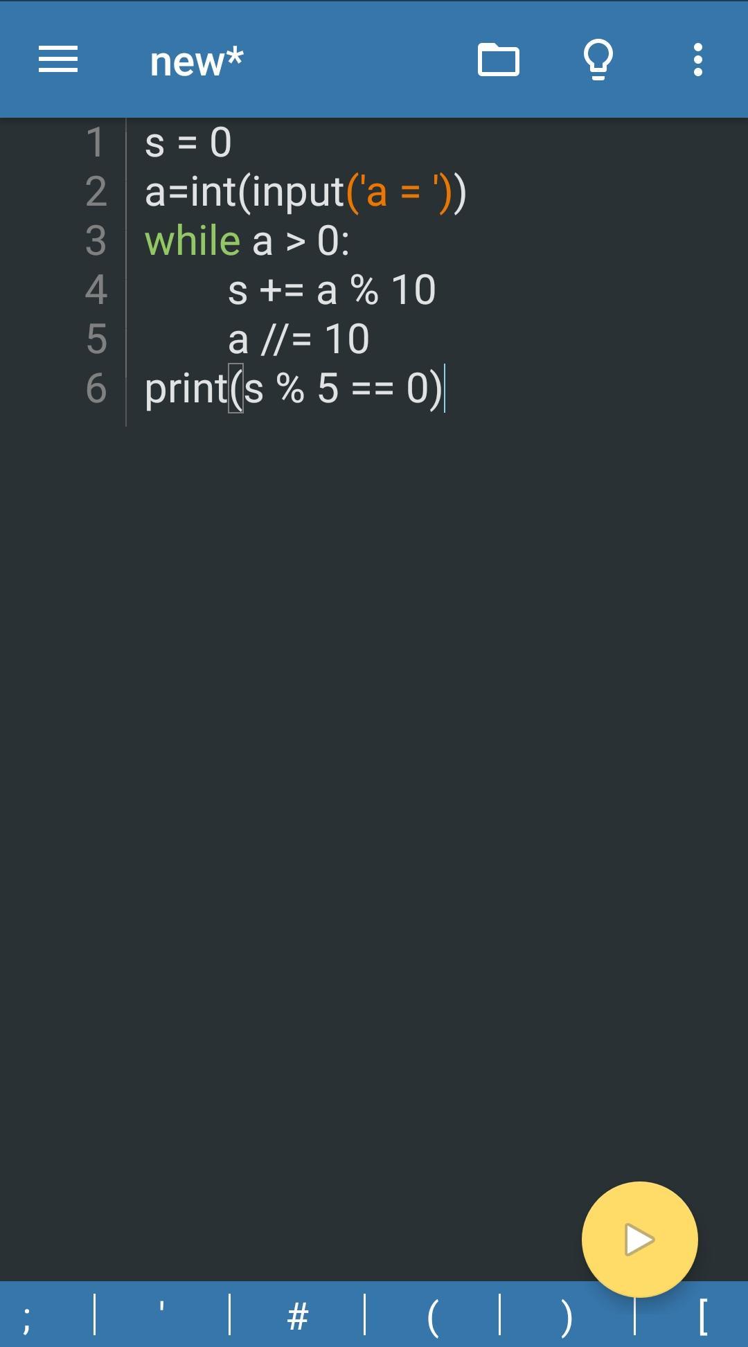 Составьте программу, проверяющую, верно ли утверждение, что сумма цифр введенного вами целого числа делится на 5 на питоне