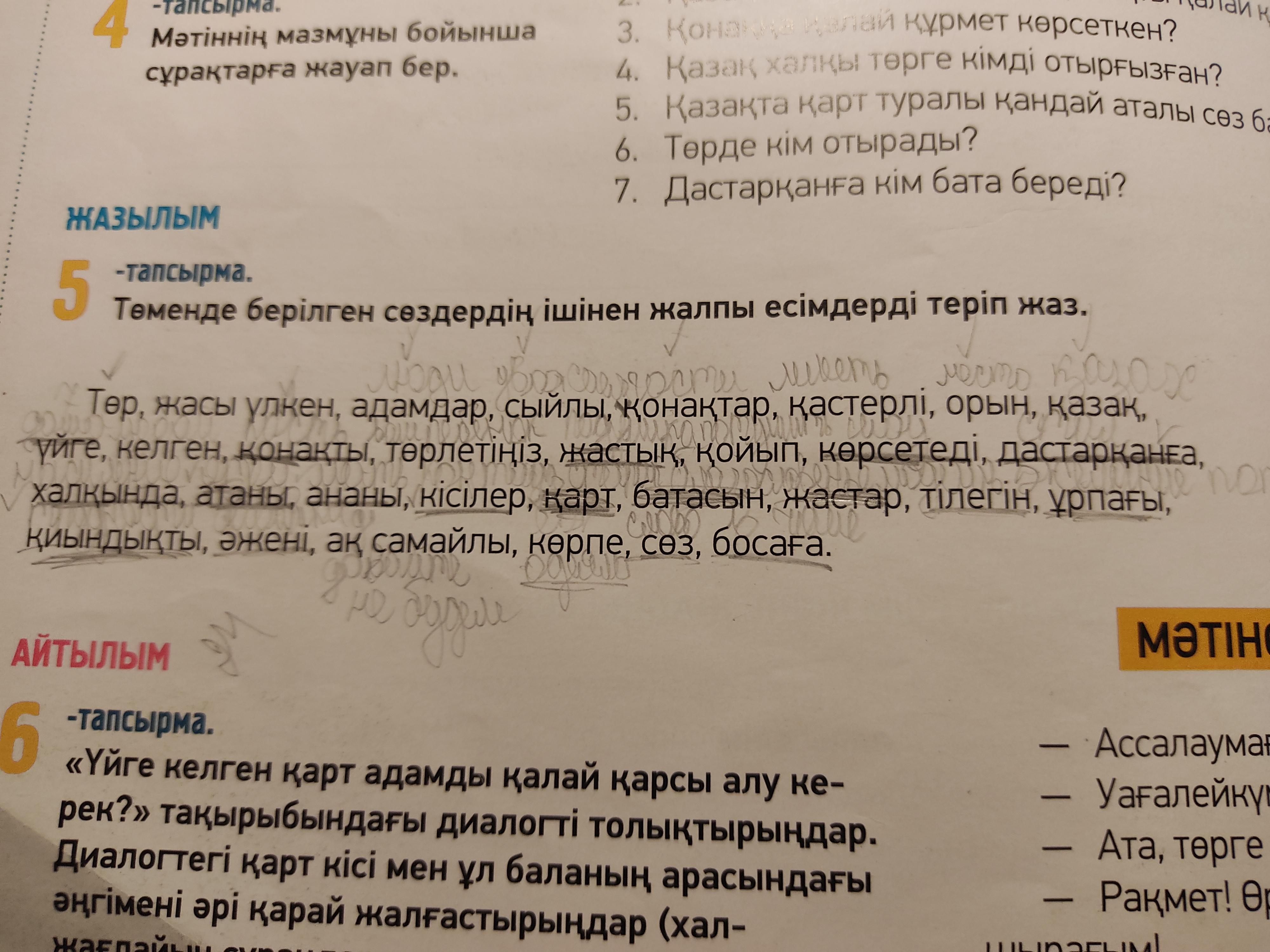 Жалпы есімдер: төр, адамдар, конактар, орын, қазақ, үйге, қонақты, жастық, дастарқанға, халқында, атаны, ананы, кісілер, карт, батасын, жастар, тілегін, ұрпағы, қиындықты, әжені, көрпе, сөз, босаға.